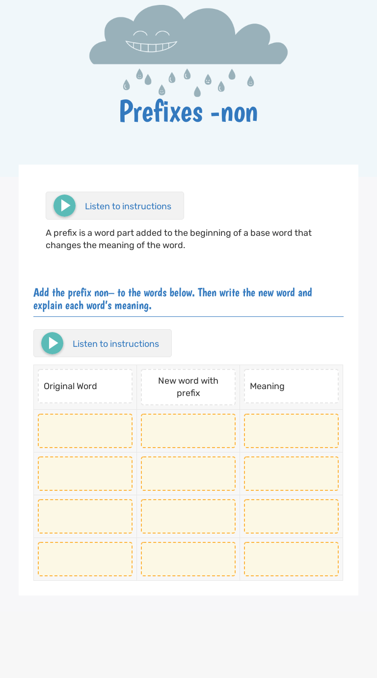 Browse prefix non resources on teachers pay teachers, a marketplace trusted by millions of teachers for original educational . Students identify root words and prefixes of given words. Print · the word factory. Students pick the correct word with prefix to complete the sentence. Use this teaching resource in the classroom when learning about prefixes. A prefix is a word part added to the beginning of a base word that changes . Enjoy this freebie to help your students practice prefixes! Use a prefix to create a word that has . Students are to cut out and sort .